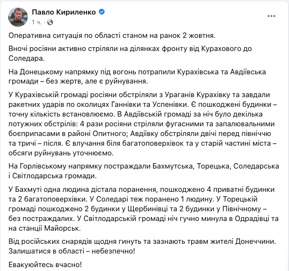 Россияне вели интенсивную стрельбу на участке от Курахово до Соледара. Фото: facebook/pavlokyrylenko.donoda