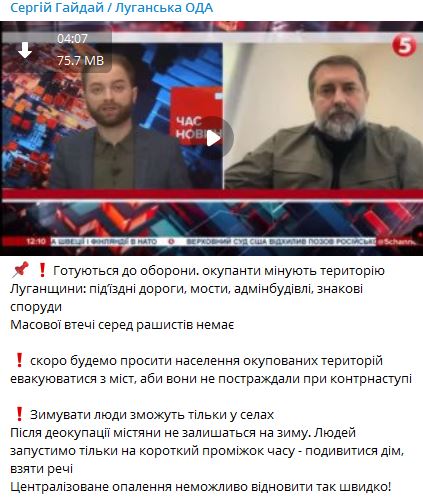 Также Сергей Гайдай указал, что оккупанты, готовясь к обороне, минуют территорию Луганщины: подъездные дороги, мосты, админздания, знаковые сооружения.