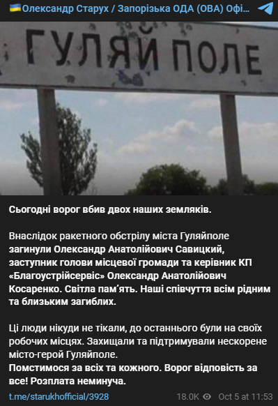 "В результате ракетных обстрелов города Гуляйполе погибли Александр Савицкий, заместитель председателя местной громады, и руководитель КП "Благоустройствосервис" Александр Косаренко", - рассказал он.