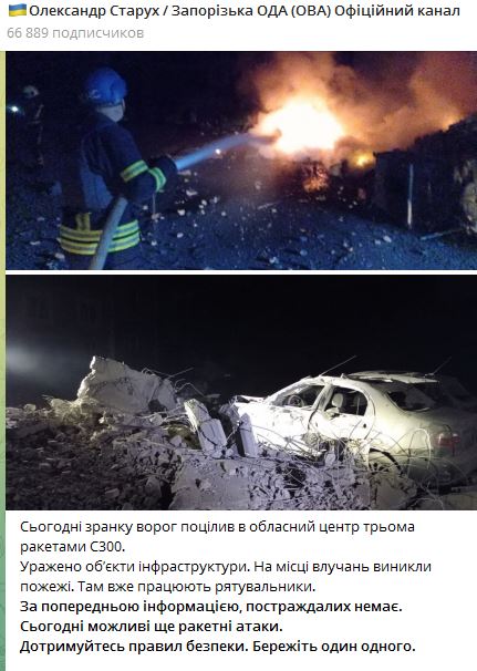 Сегодня утром по Запорожью РФ выпустила три ракеты С 300. Пострадала инфраструктура города. Возникли пожары. Предварительно пострадавших нет.