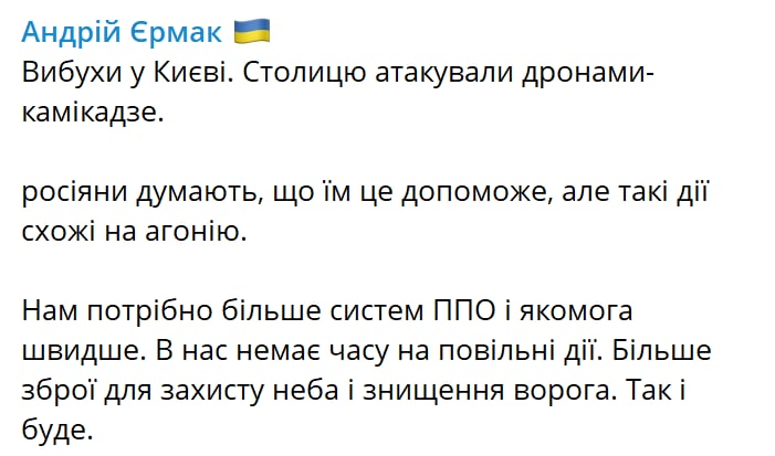 07:12 Глава Офиса президента Андрей Ермак подтвердил атаку дронов-камикадзе по Киеву.