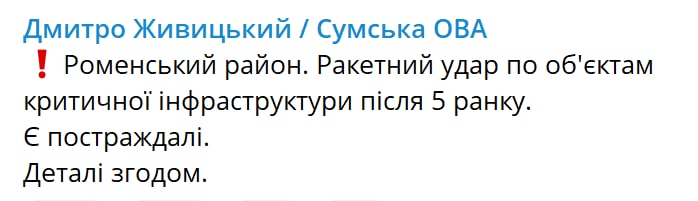 07:24 В Роменском районе Сумской области с утра ракеты поразили объект критической инфраструктуры. Есть пострадавшие, сообщил губернатор Дмитрий Живицкий.