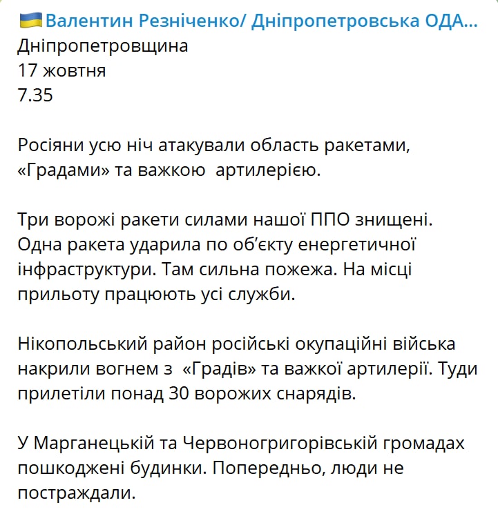 07:45 Несмотря на три сбитые ракеты, одна из них ударила по объекту энергетики в Днепропетровской области. Об этом пишет губернатор Валентин Резниченко.