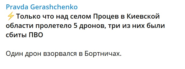08:17 Над селом Процев Киевской области пролетели пять дронов, три из них были сбиты ПВО, сообщает советник главы МВД Антон Геращенко.