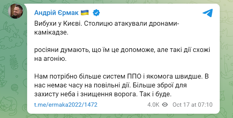 Ермак заявил, что Украине нужно больше систем ПВО и как можно быстрее.