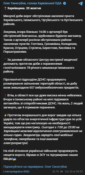 Также Синегубов рассказал, что россияне обстреливали из артиллерии населенные пункты Харьковского, Изюмского, Чугуевского и Купянского районов области. Ранения получил 78-летний житель Изюмского района.