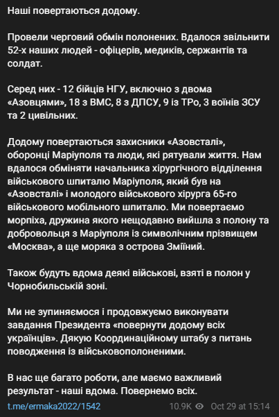 Сообщается, что в Украину вернулись 52 человека - офицеры, медики, сержанты и солдаты. Среди них - 12 бойцов Нацгвардии, включая двух "азовцев", 18 моряков, 8 из госналоговой службы, 9 из теробороны, трое солдат ВСУ и двое гражданских.