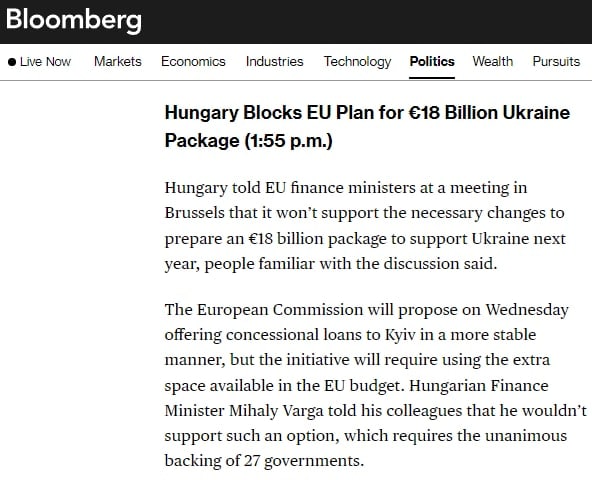 09:50 Венгрия заблокировала план ЕС по пакету помощи Украине на 18 млрд евро, пишет Bloomberg со ссылкой на источники.