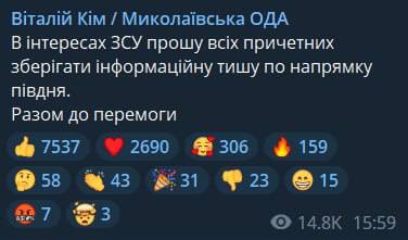 "Никто не заметил ни позавчера, ни вчера массовой переправы живой силы и техники с правого берега Днепра на левый в районе Херсона", - написал он и усомнился в реалистичности такой переправы.