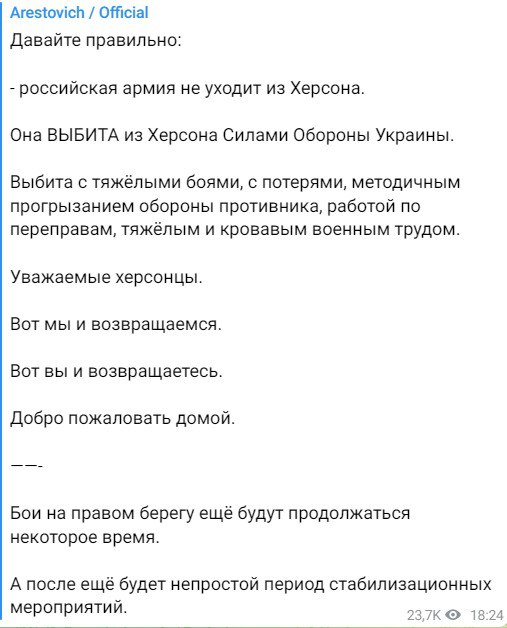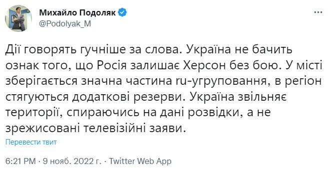 22.10 Россияне отходят в Херсонской области, но глубина этого отхода еще изучается.