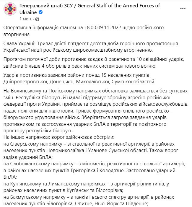 В среду, 9 ноября, в Украине идет уже 259-й день войны с РФ.