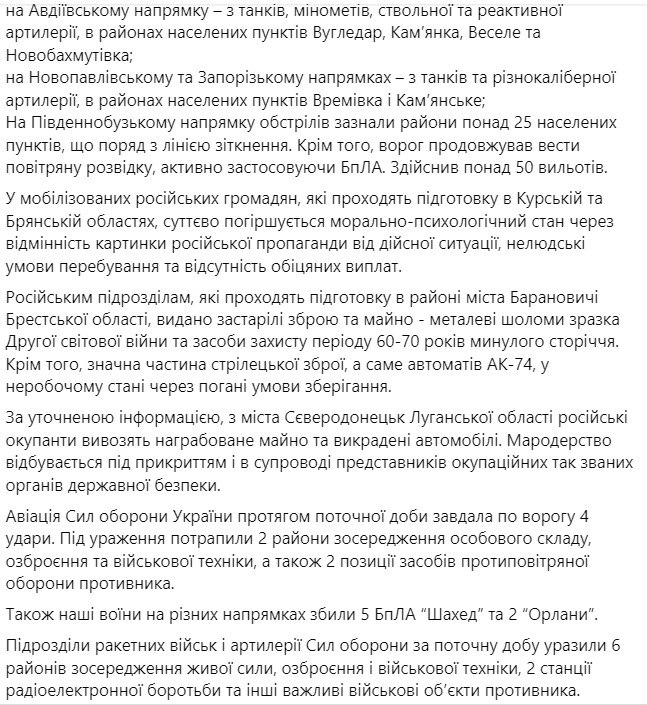 1. Противник ведет наступательные действия в Бахмутском, Авдеевском и Новопавловском направлениях.