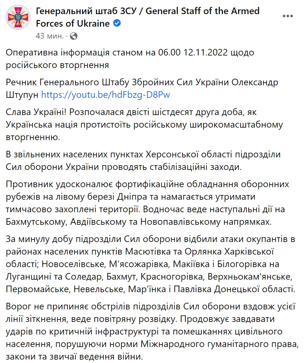 В субботу, 12 ноября, в Украине идет уже 262-й день войны с РФ. Генштаб ВСУ публикует свежую сводку с фронта. Сообщается, что в освобожденных населенных пунктах Херсонской области подразделения Сил обороны Украины проводят стабилизационные мероприятия, а противник усовершенствует фортификационное оборудование на левом берегу Днепра и пытается удержать временно захваченные территории.