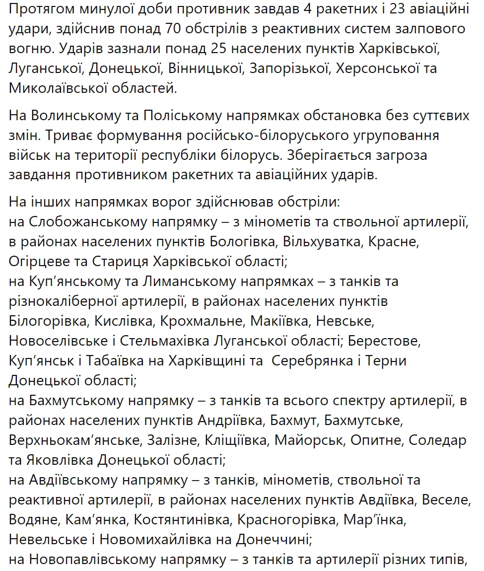 - РФ продолжает наносить удары по критической инфраструктуре и жилищам гражданского населения, нарушая нормы Международного гуманитарного права, законы и обычаи ведения войны. За прошедшие сутки противник нанес 4 ракетных и 23 авиационных удара, совершил более 70 обстрелов из реактивных систем залпового огня. Удары получили более 25 населенных пунктов Харьковской, Луганской, Донецкой, Винницкой, Запорожской, Херсонской и Николаевской областей.