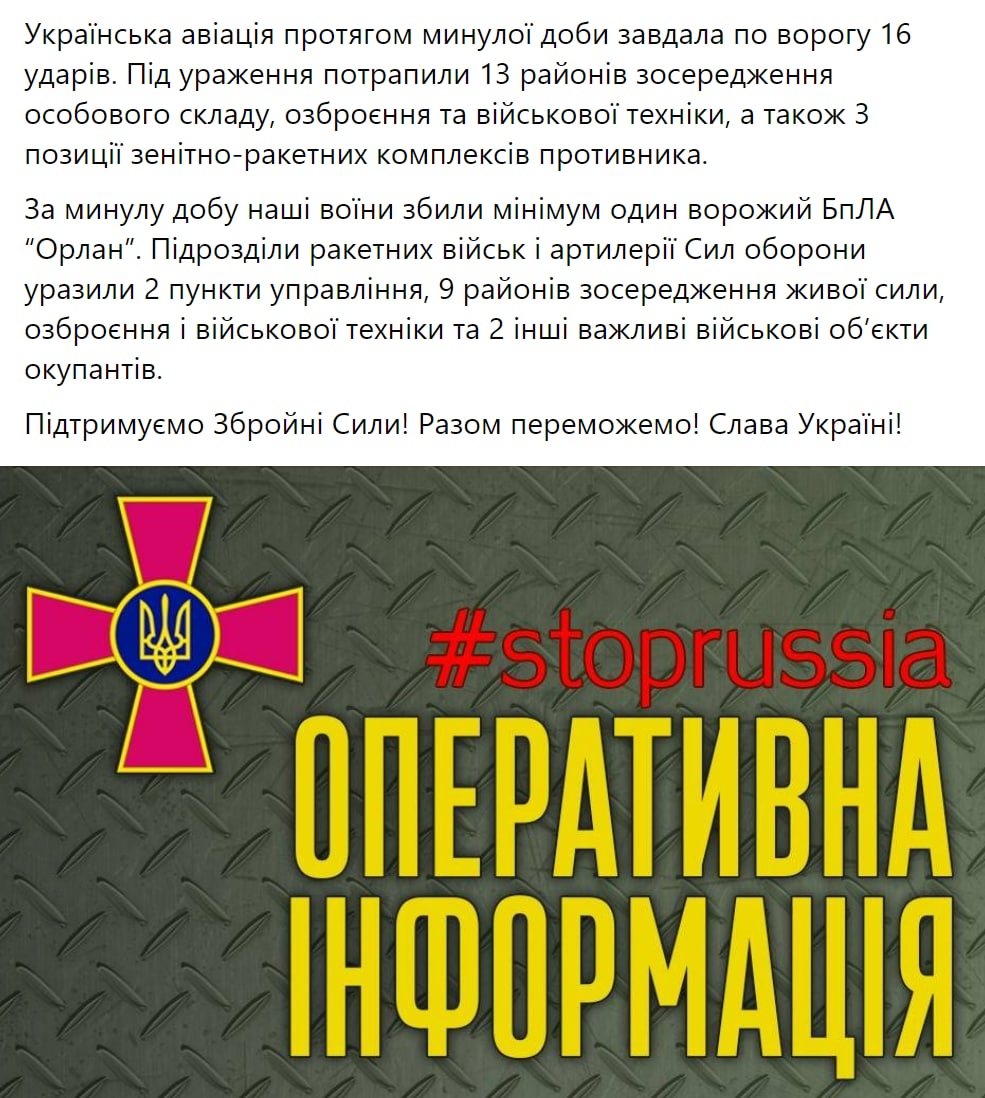 - Украинская авиация за прошедшие сутки нанесла по врагу 16 ударов. Под поражение попали 13 районов сосредоточения личного состава, вооружения и военной техники, а также 3 позиции зенитно-ракетных комплексов противника.