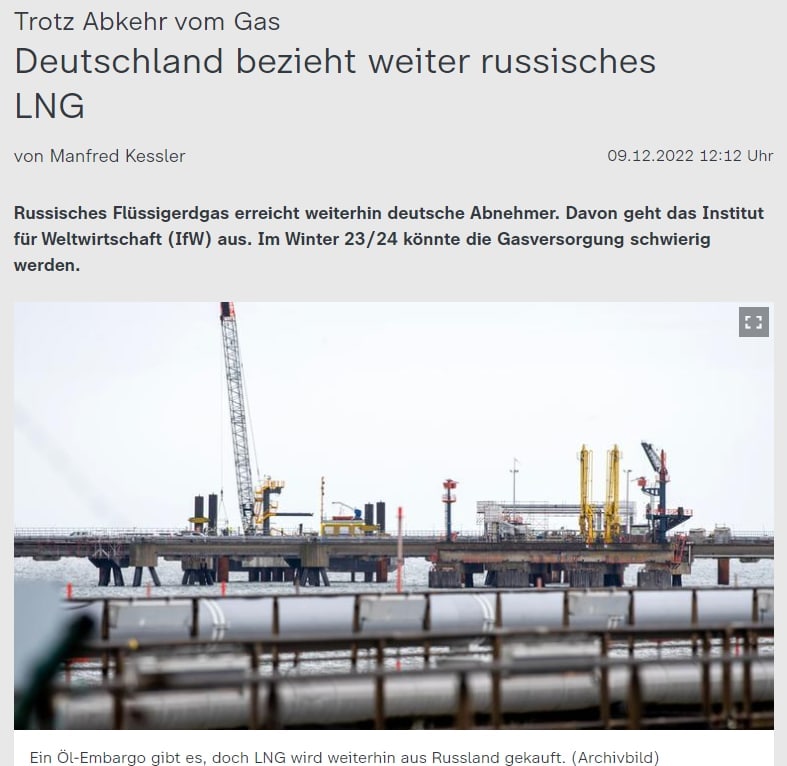 Издание напоминает, что правительство ФРГ официально объявило о намерении отказаться от российского газа. Тем не менее, по словам вице-президента Кильского института Стефана Коотса, СПГ из России, судя по всему, прибывает в Бельгию, откуда его потом перевозят в Германию.