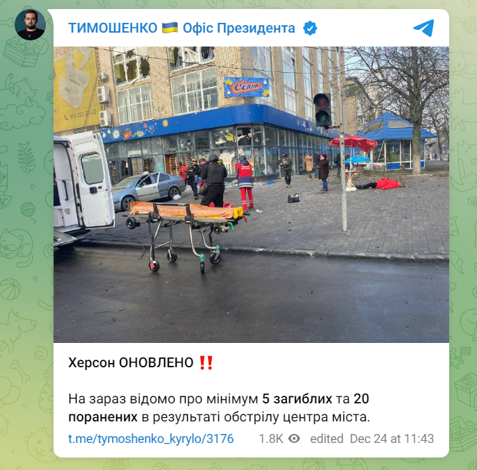 В субботу, 24 декабря, россияне обстреляли центр Херсона. Известно минимум о пятерых погибших и 20 пострадавших.