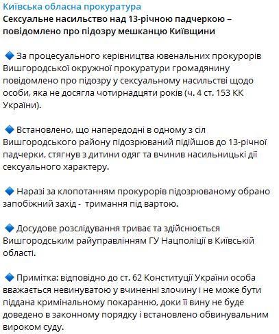 "Накануне в одном из сел Вышгородского района подозреваемый подошел к 13-летней падчерице, стянул с ребенка одежду и совершил насильственные действия сексуального характера. По ходатайству прокуроров подозреваемому избрана мера пресечения - содержание под стражей", - говорится в тексте.
