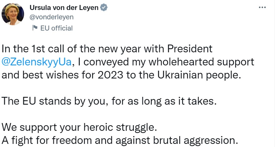 "В 1-м в новом году звонке президенту Владимиру Зеленскому я передала украинскому народу свою искреннюю поддержку и наилучшие пожелания в 2023 году", - написала Урсула фон дер Ляйен .