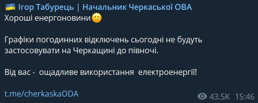 Во Львовской и Черкасской областях, где с утра власти обещали не отключать свет до 16:00, теперь обещают не выключать электричество до полуночи.