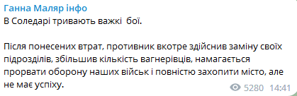 "В Соледаре продолжаются тяжелые бои. После понесенных потерь противник в очередной раз произвел замену своих подразделений, увеличил количество вагнеровцев, пытается прорвать оборону наших войск и полностью захватить город, но не имеет успеха", - заявила Маляр.