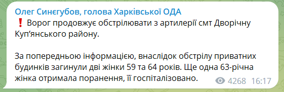 Об этом сообщил глава Харьковской ОВА Олег Синегубов в телеграм-канале.