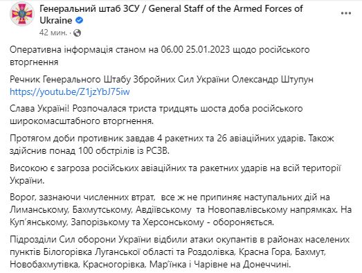 Утром 25 января Генштаб ВСУ обнародовал сводку о ситуации на фронте.