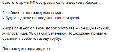 6 февраля армия РФ обстреляла одну из церквей в Херсоне. Погибших и пострадавших нет. В здании повреждены окна и двери.
