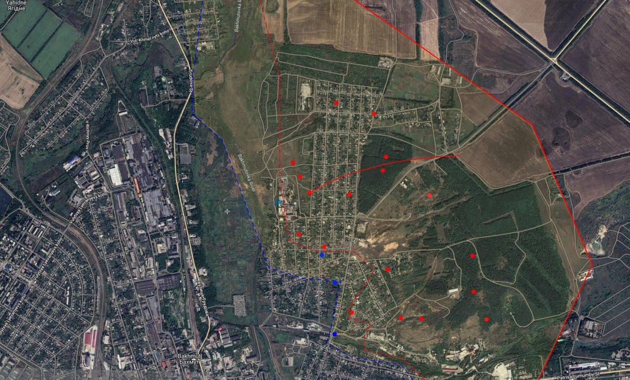 Судя по опубликованной им карте, "вагнеровцы" находятся в микрорайоне Восточный и севернее от него (их предполагаемые позиции обозначены на карте красными точками).