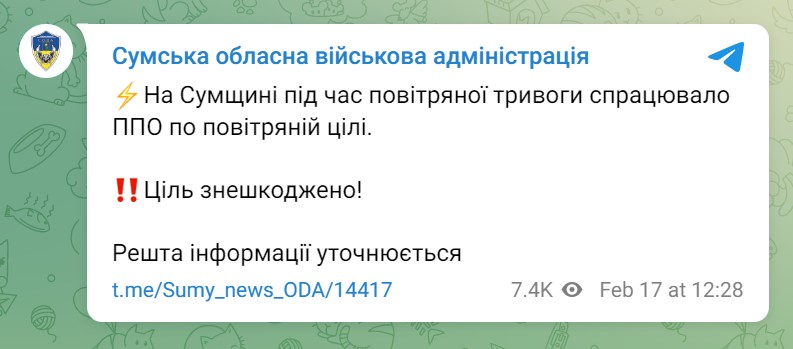 В Сумской области днем в пятницу, 17 февраля, была воздушная тревога. Противовоздушная оборона (ПВО) Украины сработала по цели.