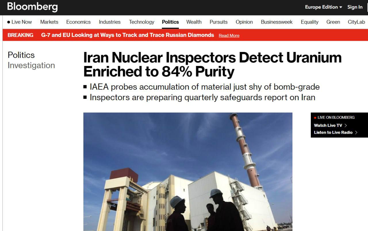 23:29 Иран опроверг сообщение Bloomberg о повышении степени обогащения урана до 84%, что всего на 6% меньше, чем нужно для создания ядерного оружия.