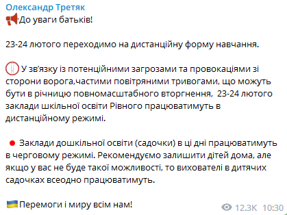 "В связи с потенциальными угрозами и провокациями со стороны врага, частыми воздушными тревогами, которые могут быть в годовщину полномасштабного вторжения, 23-24 февраля заведения школьного образования Ровно будут работать в дистанционном режиме", - рассказал мэр Ровно Александр Третяк.