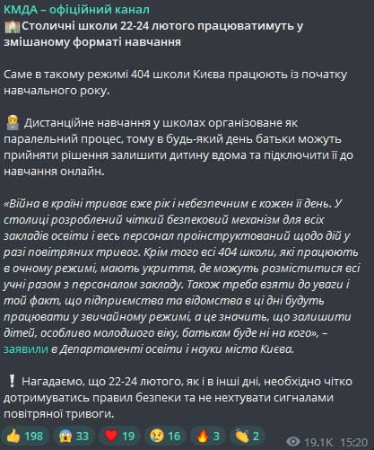 Напомним, Минобразования рекомендовало школам Украины перейти на дистанционное обучение с 22 по 24 февраля из-за угрозы ракетных ударов.