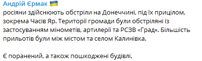 По данным Ермака, территории Часов Яра были обстреляны с применением минометов, артиллерии и РСЗО "Град". Большинство прилетов было между городом и селом Калиновка. Есть раненые, а также поврежденные здания.
