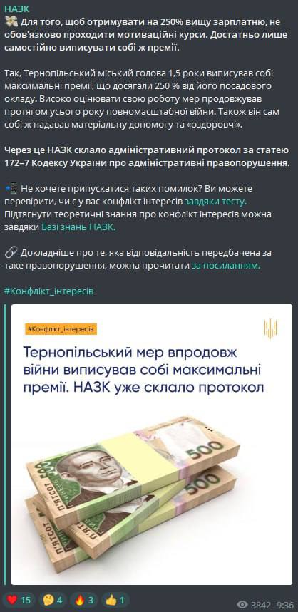 НАЗК составило админпротокол по ст. 172-7 КоАП (нарушение требований по предотвращению и урегулированию конфликта интересов, штраф - до четырехсот необлагаемых минимумов доходов граждан).