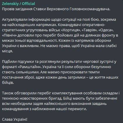 "Актуализировали информацию о ситуации на поле боя, в том числе по самым сложным направлениям. Командующие оперативно-стратегическими группировками войск "Хортица", "Таврия", "Одесса", "Север" доложили о ходе боевых действий на участках фронта в пределах их ответственности. Каждое из направлений обороны Украины важно. Не имеем права, чтобы у Украины были слабые места", - сообщил Зеленский.