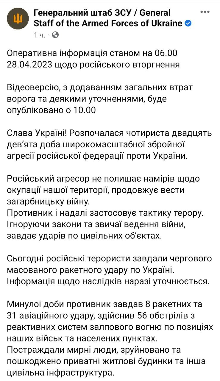 Война в Украине продолжается уже 429-й день. Мы следим за новостями 28 апреля в своем онлайне. Сегодня ночью РФ осуществила очередную массированную ракетную атаку. Под ударом были Киевская, Черкасская, Днепропетровская область. В Умани ракета попала в жилую многоэтажку.
