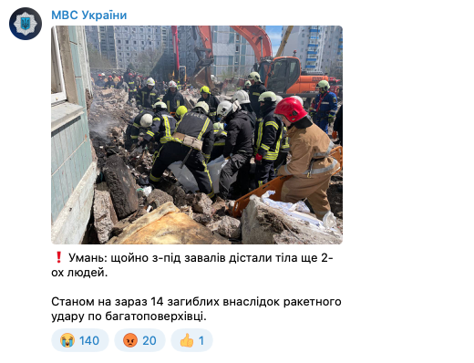 Ранее сообщалось о 10 погибших, среди погибших в Умани - двое десятилетних детей. К разборам завалов привлечены 148 человек и 36 единиц техники, в том числе 2 кинологических расчета. Также в МВД назвали тип ракеты, которой противник ударил по городу - Х-101.