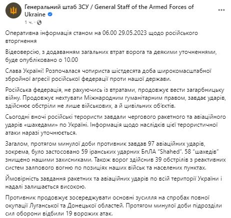 2. В общей сложности, за прошедшие сутки противник нанес 97 авиационных ударов, в частности, было применено 59 "Шахедов", 58 из них были уничтожены. Также враг совершил 39 обстрелов из РСЗО по позициям ВСУ и населенным пунктам.