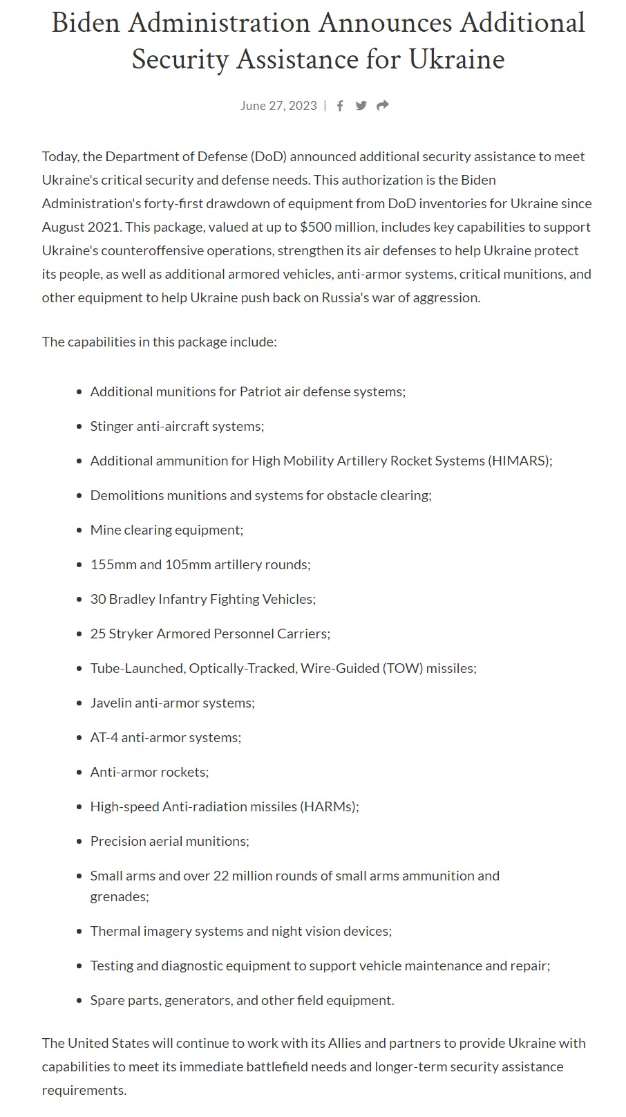 "Сегодня Министерство обороны объявило о дополнительной помощи в области безопасности для удовлетворения критически важных потребностей Украины в области безопасности и обороны. Это решение является сорок первой передачей оборудования администрацией Байдена из запасов Минобороны для Украины с августа 2021 года. Этот пакет стоимостью 500 миллионов долларов включает ключевые возможности для поддержки контрнаступательных операций Украины, укрепления ее противовоздушной обороны, а также дополнительную бронетехнику, противотанковые системы, критически важные боеприпасы и другое оборудование", - сказано в пресс-релизе.