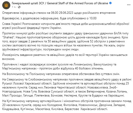 В четверг, 29 июня, Генштаб ВСУ обнародовал сводку о ситуации на фронте.