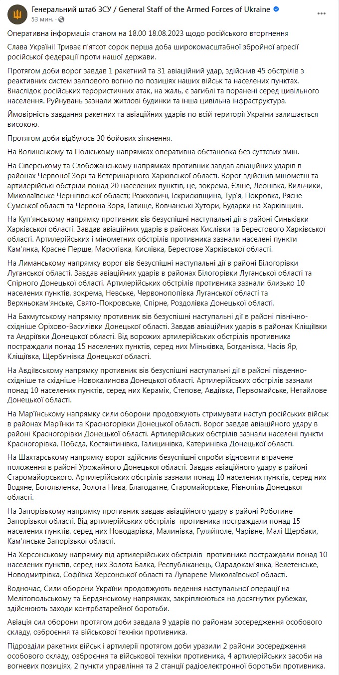 Генштаб ВСУ представил оперативную информацию о российском вторжении по состоянию на 18:00 18 августа.