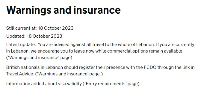 "Вам не рекомендуется путешествовать по всему Ливану. Если вы в настоящее время находитесь в Ливане, мы рекомендуем вам уехать сейчас, пока коммерческие варианты остаются доступными. Граждане Великобритании в Ливане должны зарегистрировать свое присутствие", - сказано в записи.