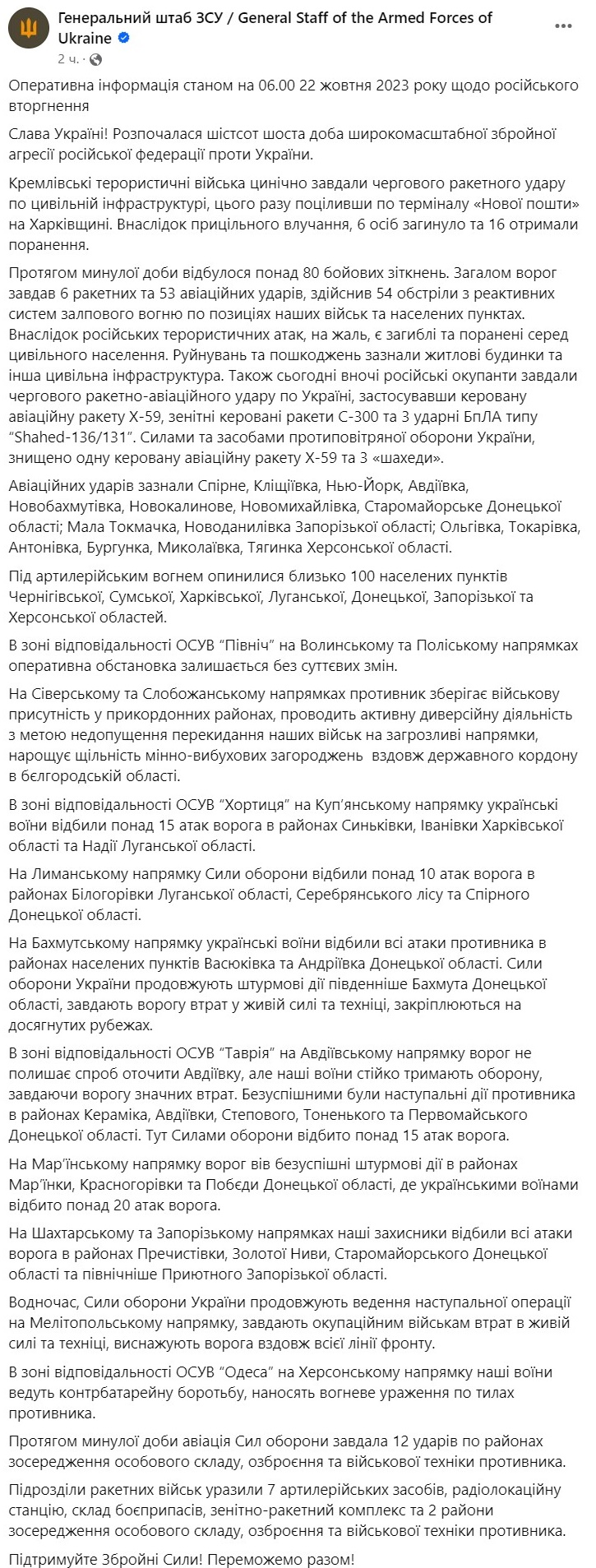 За прошедшие сутки произошло более 80 боевых столкновений. Всего россияне нанесли 6 ракетных и 53 авиационных ударов, совершили 54 обстрела из реактивных систем залпового огня по позициям наших войск и населенным пунктам.