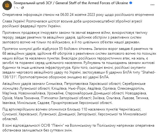 Генштаб ВСУ обнародовал сводку о ситуации на фронте на утро 24 октября.