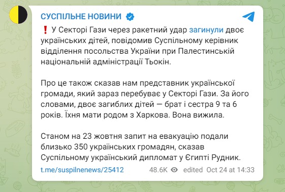 В секторе Газа в результате израильского ракетного удара погибли двое украинских детей.