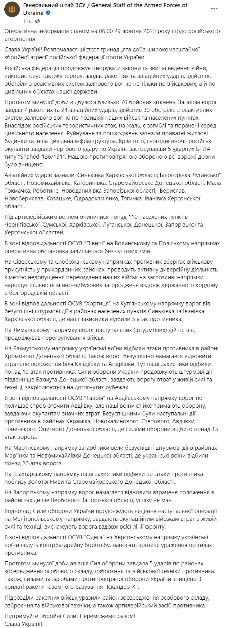Война в Украине идет уже 613-й день. Мы следим за последними новостями и ключевыми событиями 29 октября 2023 года в обновляемом онлайне.