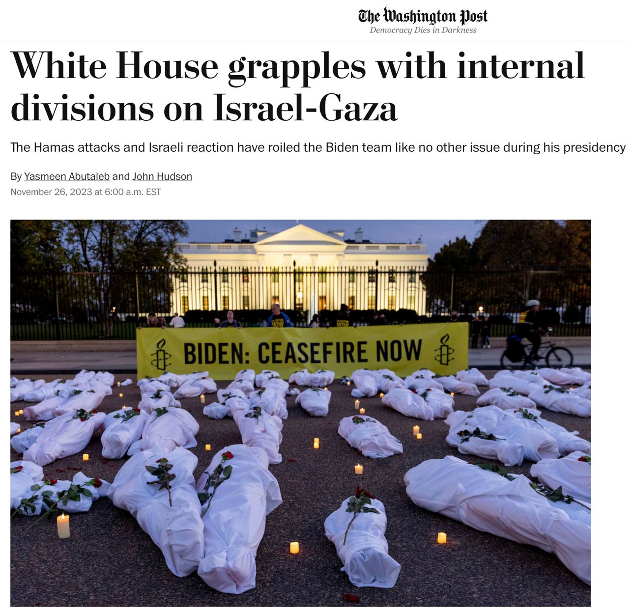 "Встреча официальных лиц подчеркивает, как действия Байдена в разрешении, возможно, крупнейшего внешнеполитического кризиса за время его президентства, разделяют Белый дом, который гордится тем, что проводит дисциплинированную и сплоченную операцию. По словам многочисленных помощников и союзников внутри и за пределами Белого дома, война между Израилем и сектором Газа взволновала администрацию больше, чем любой другой вопрос за первые три года пребывания Байдена у власти, поскольку его сотрудники мучаются из-за своей позиции по крайне эмоциональным вопросам", - пишет WP.