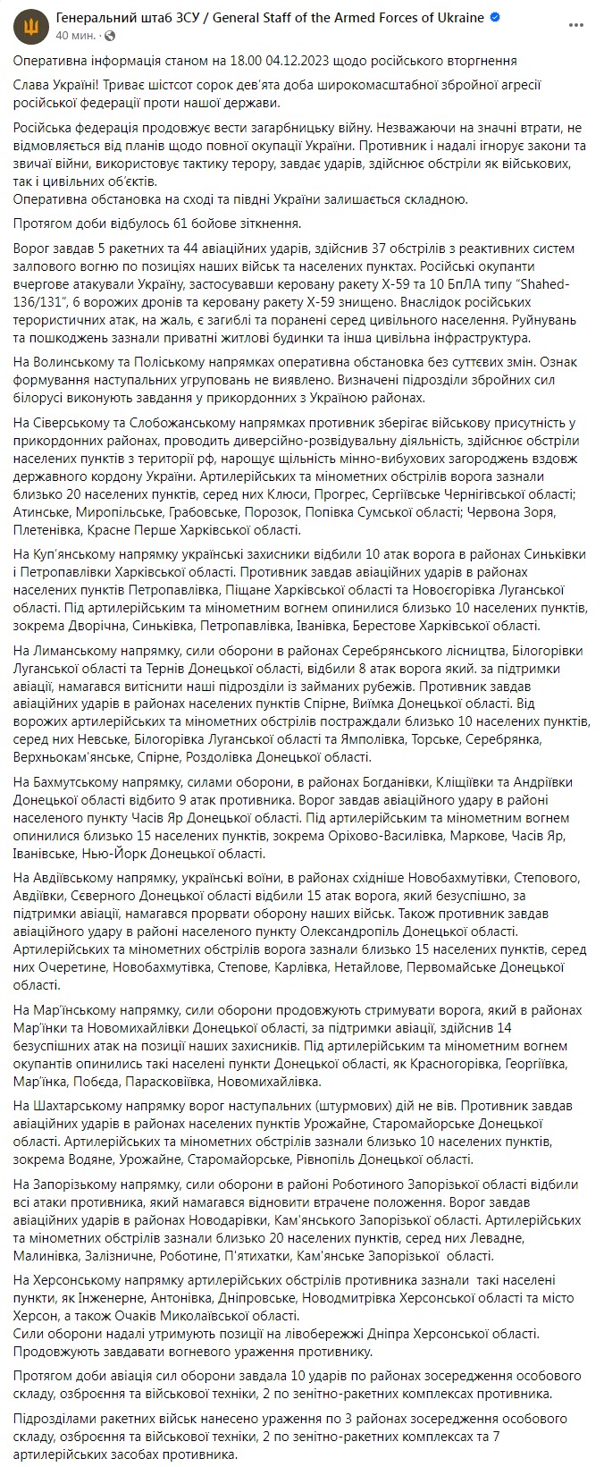 Война в Украине идет уже 649-й день. Мы следим за последними новостями и ключевыми событиями 4 декабря 2023 года в обновляемом онлайне.