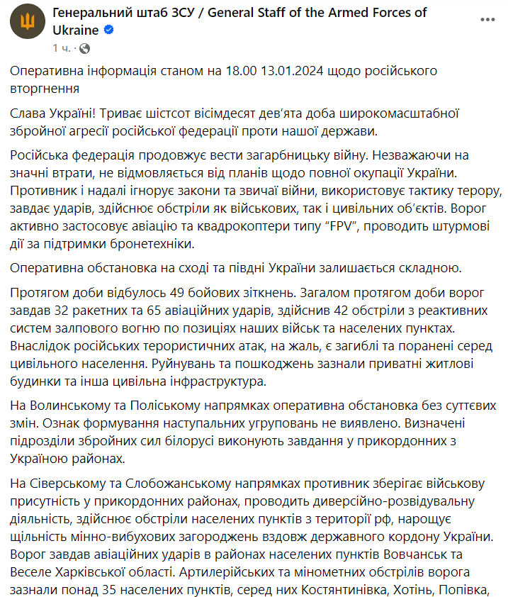 В Генеральном штабе Вооруженных сил Украины опубликовали оперативную сводку с фронта по состоянию на 18:00 13 января.